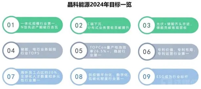 1月2日,光伏電池、組件龍頭晶科能源(688223.SH)官微發文披露了自身2024年的“小目標”。其中,第一條就是“一體化規模行業第一,N型先進產能突破100GW”。在業務層面,相關目標還有“分布式業務營收貢獻提升”“儲能貢獻可觀營收”“儲能、電芯業務劍指行業TOP5”等;在技術研發方面,主要目標有“TOPCon量產電池效率26.5%+,穩居行業第一”“專利價值、專利布局、專利運營行業第一”;此外還有涉及全球化、供應鏈智能綠色升級、ESG等相關領域的目標。