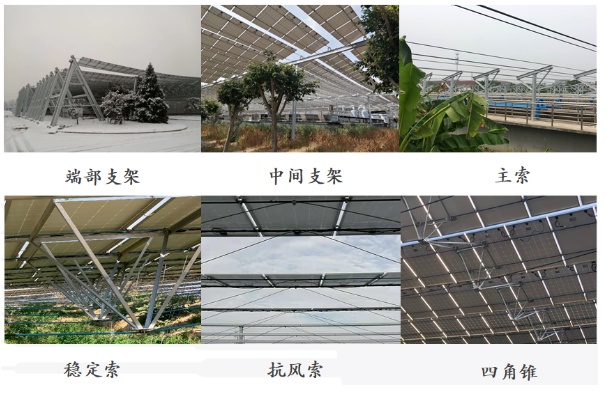 為了保證光伏板的安全,支架系統(tǒng)需要做到“剛?cè)岵?jì)”。這里“剛”指的就是端部和中部支架,端部支架位于系統(tǒng)的左右兩端,為系統(tǒng)提供豎向和水平支撐,而當(dāng)跨度過大時,為防止“晾衣繩”中間變形過大,需設(shè)置一些中間支架。這樣,整個體系的剛性框架就搭成了。