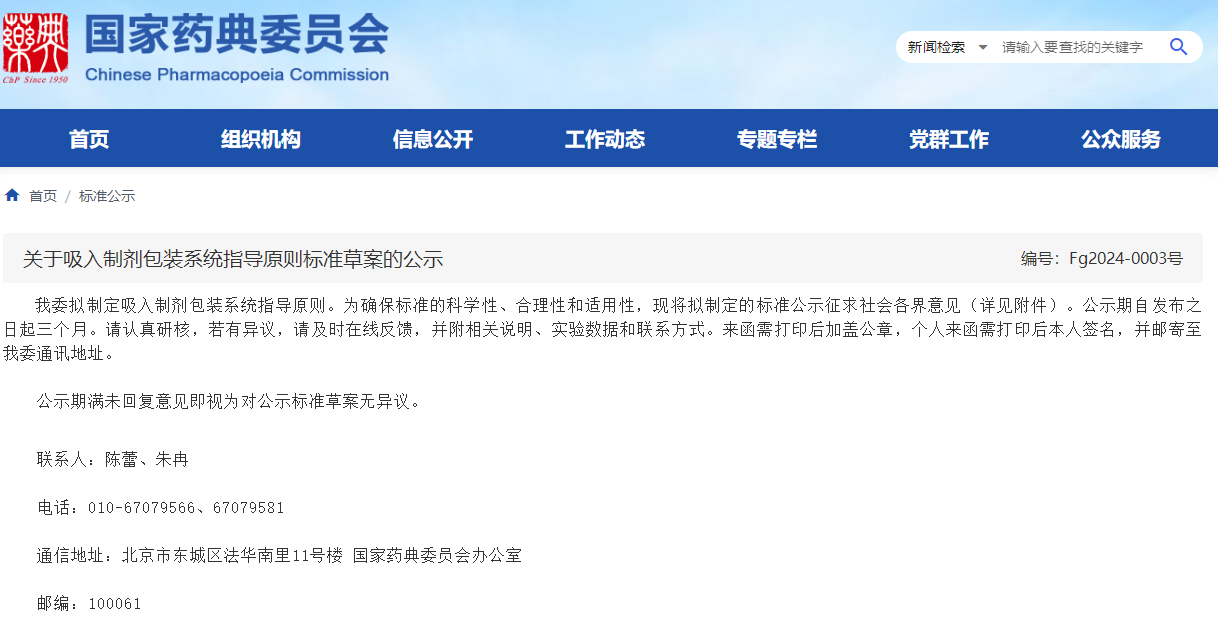 中國粉體網(wǎng)訊 1月11日,國家藥典委發(fā)布關(guān)于吸入制劑包裝系統(tǒng)指導(dǎo)原則標(biāo)準(zhǔn)草案的公示,擬制定吸入制劑包裝系統(tǒng)指導(dǎo)原則。公示期自發(fā)布之日起三個月。為確保標(biāo)準(zhǔn)的科學(xué)性、合理性和適用性,現(xiàn)將擬制定的標(biāo)準(zhǔn)公示征求社會各界意見(詳見附件)。