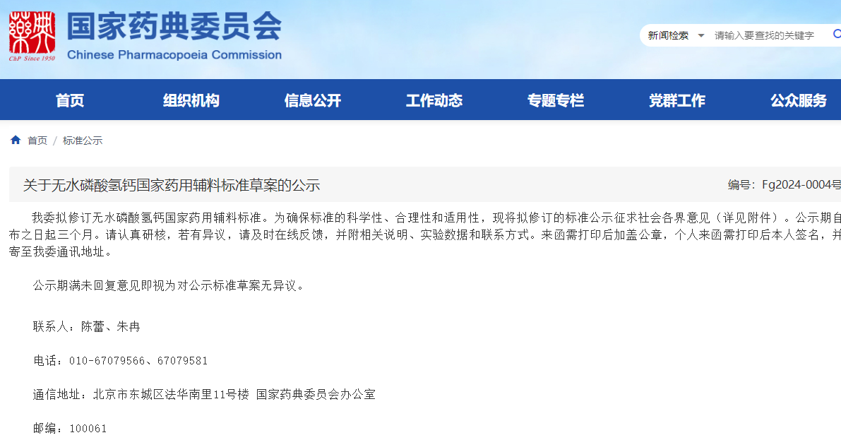 同日,國家藥典委發(fā)布關(guān)于無水磷酸氫鈣國家藥用輔料標(biāo)準(zhǔn)草案的公示,擬修訂無水磷酸氫鈣國家藥用輔料標(biāo)準(zhǔn)。公示期自發(fā)布之日起三個月。為確保標(biāo)準(zhǔn)的科學(xué)性、合理性和適用性,現(xiàn)將擬修訂的標(biāo)準(zhǔn)公示征求社會各界意見(詳見附件)。