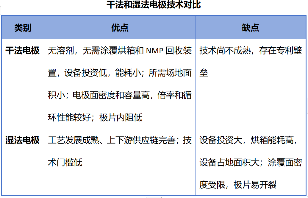 中國粉體網訊 傳統的濕法電極制作過程中,一方面,勻漿會用到有毒的溶劑N-甲基吡咯烷酮(NMP),NMP的回收設備昂貴且能耗巨大,還會有部分泄漏到環境中,對人體健康和環境造成危害;另一方面,無論采用何種溶劑,均需烘箱蒸發,不僅占用大量場地空間,而且能耗巨大。此外,濕法電極的涂覆厚度受限,涂覆太厚,極片在烘干過程容易開裂、剝落。