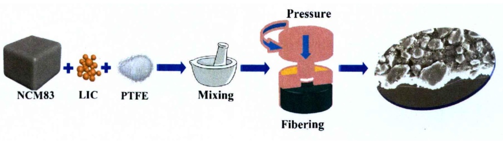 王晶通過稱取一定比例的NCM83、Li3InCl6和PTFE在研缽內混合均勻,之后轉移到鋼質模具中在350MPa的壓強下混合使PTEF纖維化,最后再壓制成型,得到PTFE干法電極。該電極可以準確獲得極片活性物質的質量,使得正極顆粒與電解質之間,顆粒與顆粒之間連接得更加緊密;有效減緩充放電過程中體積變化造成的正極與電解質之間接觸失活。