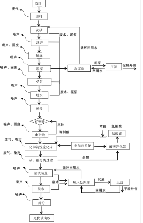 項(xiàng)目總投資5000萬(wàn),主要建設(shè)內(nèi)容為新建1條年產(chǎn)70萬(wàn)噸石英砂水洗生產(chǎn)線,1條年產(chǎn)30萬(wàn)噸光伏玻璃砂酸洗生產(chǎn)線。