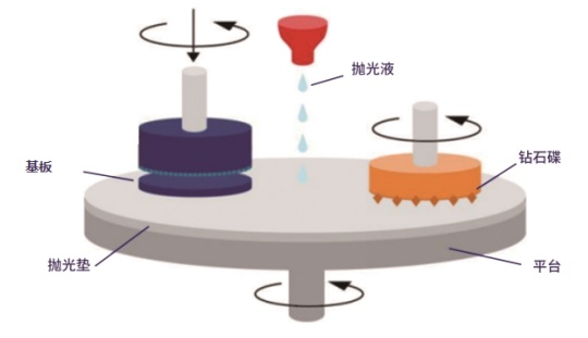 化學機械拋光(Chemical Mechanical Polishing, CMP)于1965年首次由美國的Monsanto提出,最初是用于獲取高質(zhì)量的玻璃表面。CMP技術具有獨特的化學和機械相結(jié)合的效應,是在機械拋光的基礎上,根據(jù)所要拋光的表面,加入相應的化學試劑,從而達到增強拋光和選擇性拋光的效果。在 CMP 拋光過程中,拋光液與基板表面發(fā)生化學反應,軟化基板的同時通過機械研磨將被軟化的表面去除。