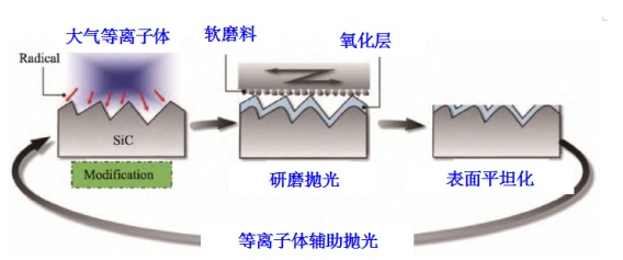 等離子體輔助拋光(PAP)技術最早是由日本大阪大學的 Yamamura 于 2010 年提出,是一種超低壓力的干法拋光技術。該技術將化學改性和物理去除相結(jié)合,通過等離子體照射進行表面改性,借助軟磨料的摩擦作用去除材料,打破了傳統(tǒng)機械加工的局限,可以獲得原子級平坦表面,不會造成亞表面損傷,能夠獲得平整度較好的表面質(zhì)量,成功應用于多種難加工材料,如SiC、AlN等陶瓷材料。