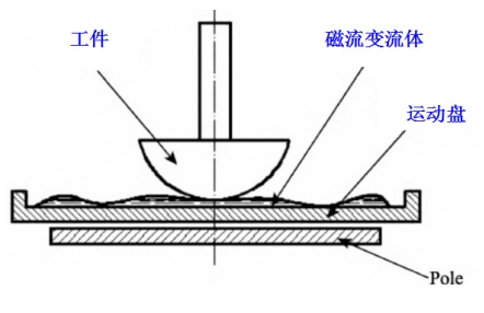 磁流變拋光工作原理為:運動盤在磁極正上方,工件位于運動盤上方并保證工件與運動盤之間有一定的距離,施加磁場時,在該空隙處會形成高強度的梯度磁場。運動盤內(nèi)有大量磁流變液,拋光開始時,磁極發(fā)生強大磁場致使磁流變液從牛頓流體變成黏度較大的 Bingham 流體。在這個過程中,磁流變拋光液中的磁性粉粒會沿著磁場分布線形成鏈狀結(jié)構(gòu),拋光中的磨料會依附在鐵粉鏈狀結(jié)構(gòu)表面,從而具有強剪切力,在工件運動過程中,通過流體動壓剪切實現(xiàn)工件表面的材料去除。