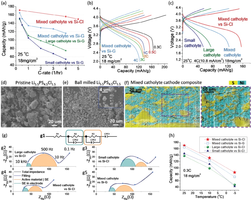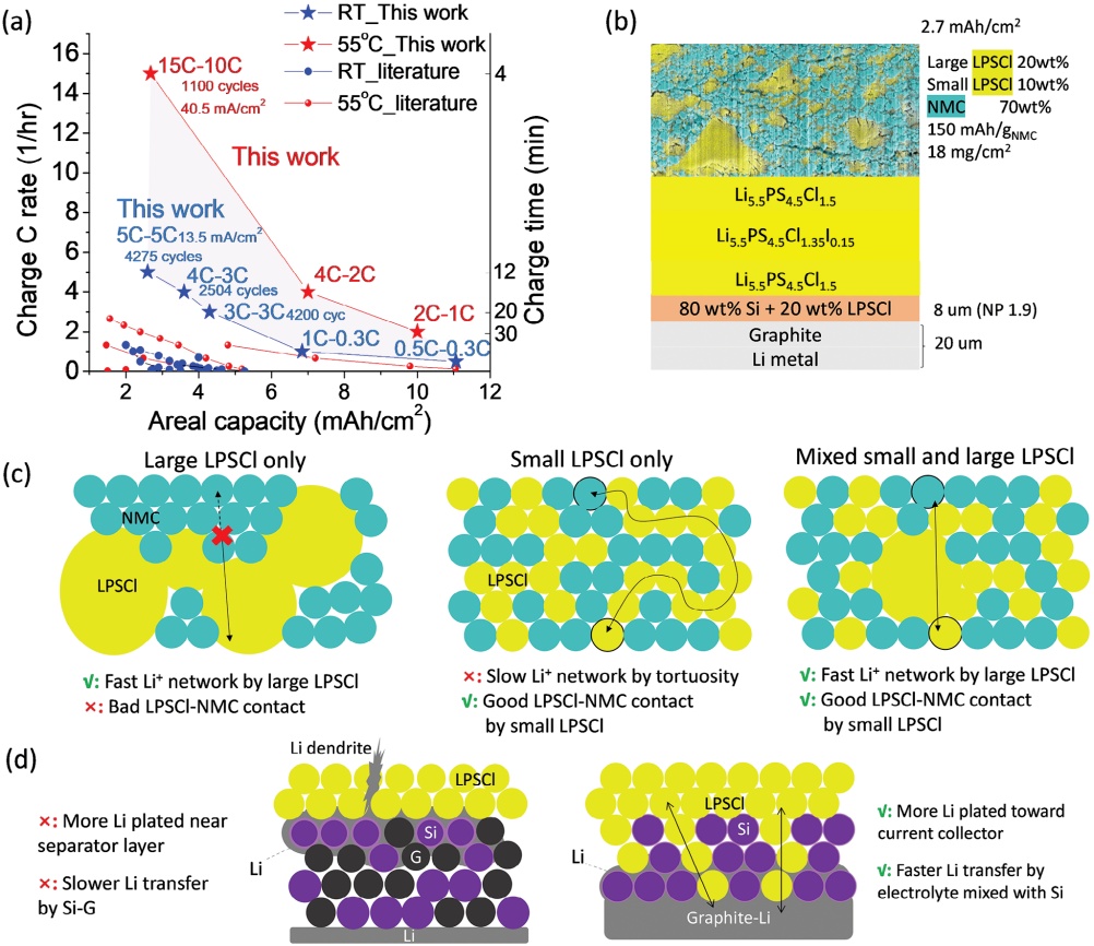 此工作中的全電池在高面容量下(>2 mAh cm-2)的高倍率性能相比同類型的硫化物電池有質的飛躍。正極電解質采用了大小顆粒混合的策略,以同時保證鋰離子以低曲折度快速穿越厚電極,以及良好的活性材料NMC與電解質的接觸。負極方面改良了硅碳|鋰金屬復合物結構,用微米硅與LPSCl電解質混合,使得鋰離子可以快速充分均勻地抵達硅顆粒的表面,以及快速通過電解質傳導到負極靠近鋰金屬一側。