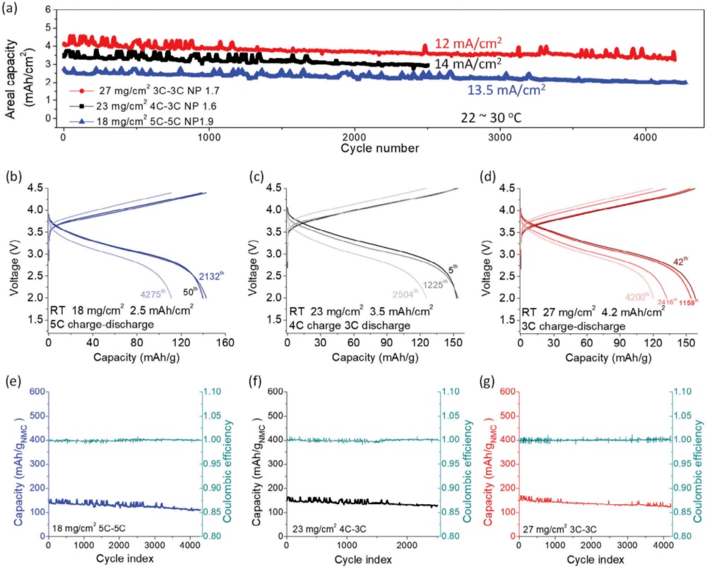 通過以上的電極結構設計,全固態電池在室溫下達到了2.5 mAh cm-2 以上3-5C倍率的長循環。得益于該動力學設計,正極的比容量在室溫下達到了~150 mAh g-1的高正極利用率。