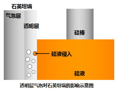 氣泡隨著高溫過程會長大、合并,有可能會導致內層石英剝落。另外,非晶態的石英坩堝在高溫下會發生晶化,形成穩定的結晶態方石英。