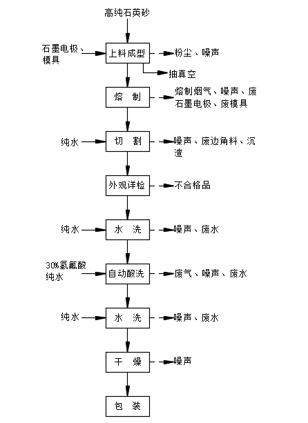 本項目太陽能級電弧石英坩堝生產主要工藝流程為:上料成型→熔制→外觀詳檢→切割→水洗→自動酸洗→水洗→干燥→包裝。