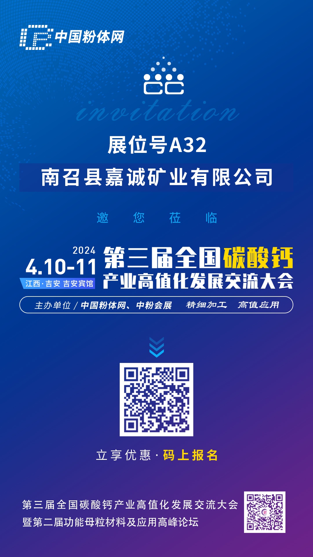由中國粉體網(wǎng)主辦的“2024第三屆全國碳酸鈣交流會”將于2024年4月10-11號在江西吉安舉辦,南召縣嘉誠礦業(yè)有限公司邀您一同參加。