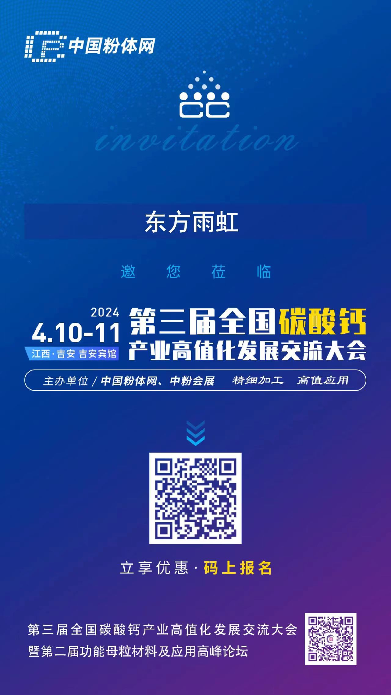 由中國粉體網主辦的“2024第三屆全國碳酸鈣交流會”將于2024年4月10-11號在江西吉安舉辦,東方雨虹邀您一同參加。
