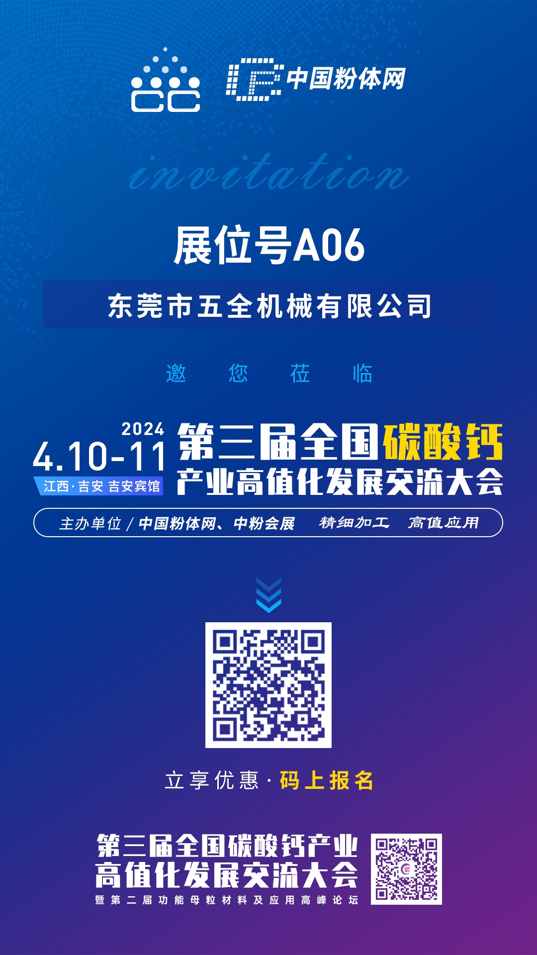 由中國粉體網主辦的“2024第三屆全國碳酸鈣交流會”將于2024年4月10-11號在江西吉安舉辦,東莞市五全機械有限公司邀您一同參加。