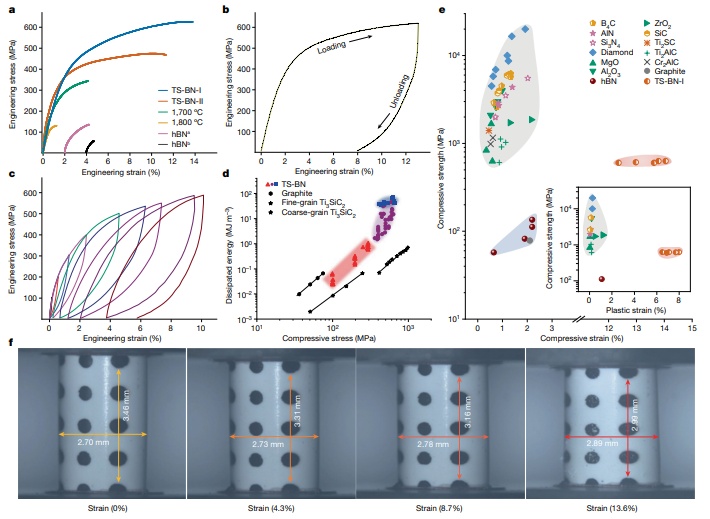 這種陶瓷采用洋蔥狀氮化硼納米前驅體,結合傳統的火花等離子體燒結和熱壓燒結工藝,形成了由互鎖的層狀納米板構成的結構,這些納米板在不同的扭曲角度下平行堆疊。該塊狀陶瓷的壓縮應變在斷裂前可達到14%,遠高于傳統陶瓷的1%的變形率,其壓縮強度也是常規六方氮化硼層狀陶瓷的六倍。這種優異的機械性能是由于納米片中扭曲層的固有變形能力的提高以及三維互鎖結構的結合,限制了變形在單個納米片上的傳播。這種扭曲層狀氮化硼塊體陶瓷的出現為制造高變形性塊體陶瓷打開了一扇大門。