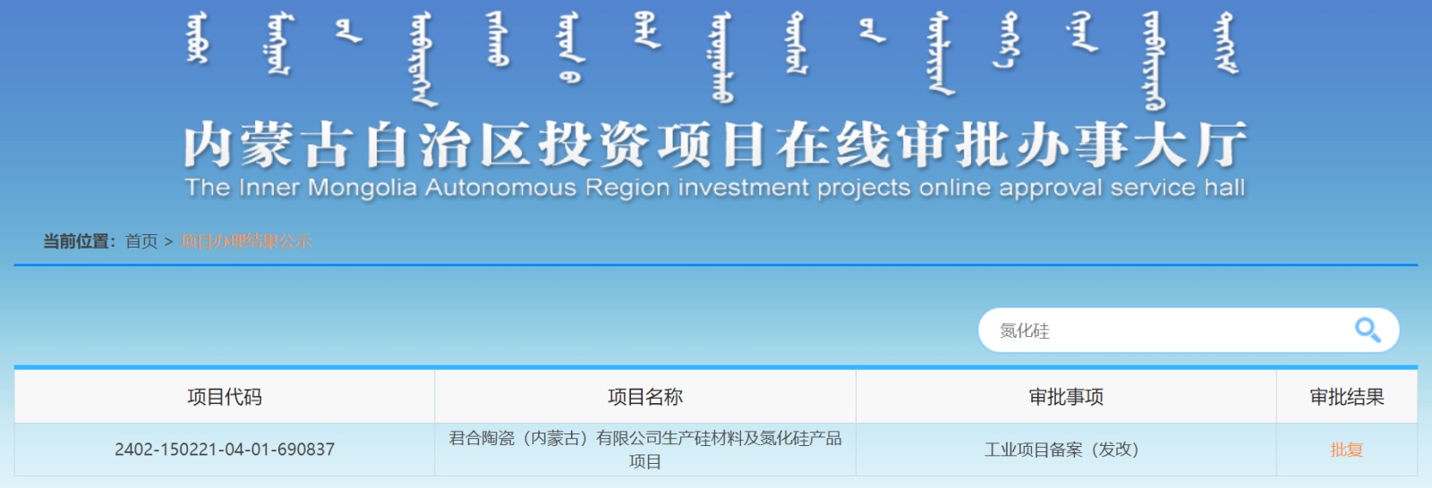 中國粉體網訊 近日,君合陶瓷(內蒙古)有限公司生產氮化硅產品項目備案通過。