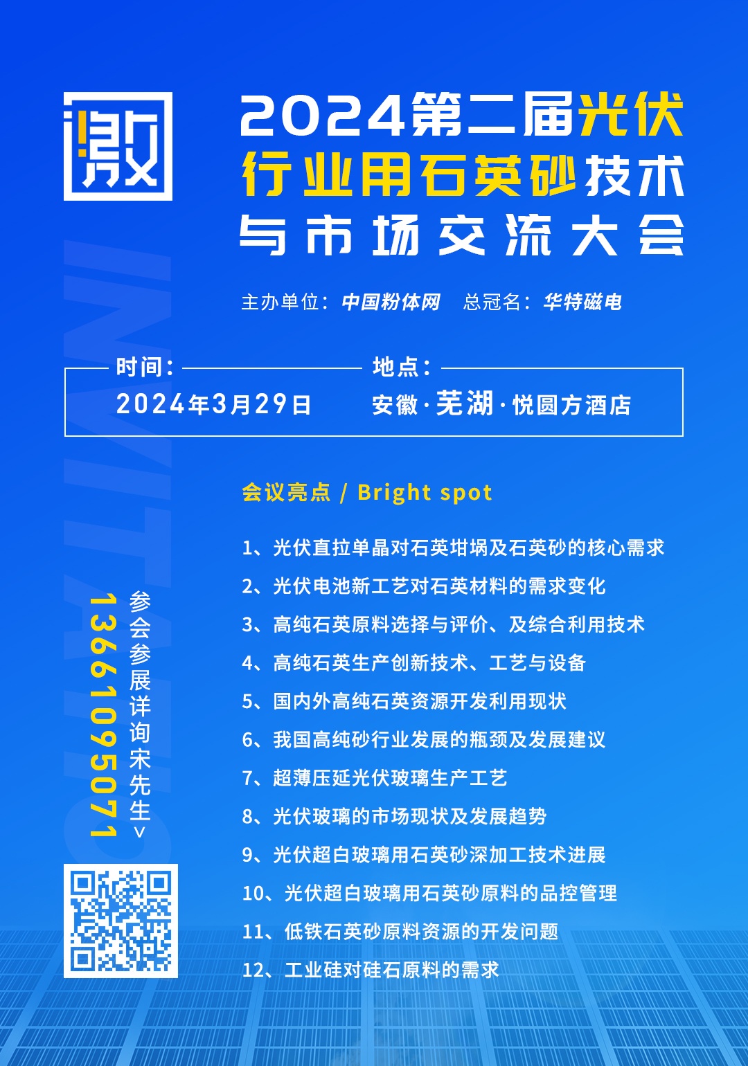 中國粉體網(wǎng)于2024年3月29日在安徽蕪湖舉辦“第二屆光伏行業(yè)用石英砂技術(shù)與市場交流大會”,洛陽中德重工有限公司邀您一同參加。