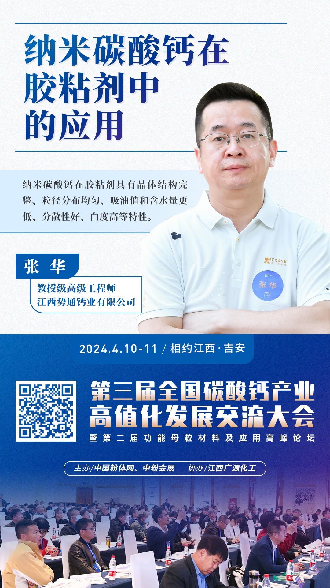 2024年4月10日~11日,第三屆全國碳酸鈣產業高值化發展交流大會將在江西·吉安舉行,屆時江西勢通鈣業有限公司董事長、教授級高級工程師張華將在大會上作《納米碳酸鈣在膠粘劑中的應用》主題報告,講解各種膠粘劑體系專業知識,分享膠粘劑專用納米碳酸鈣應用技術和產品研發心得。
