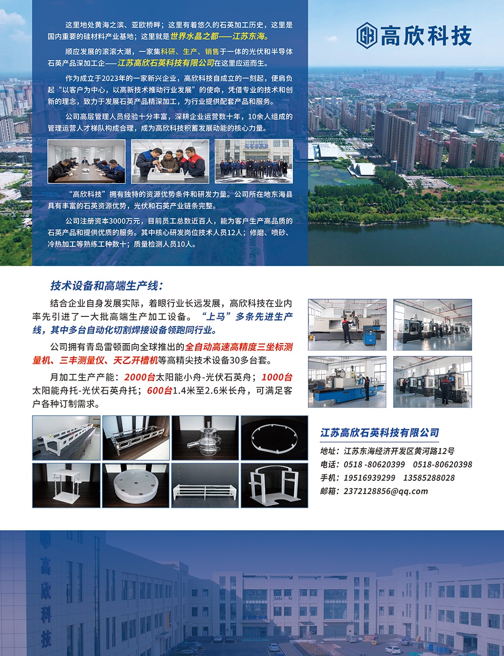 作為成立于2023年的一家新興企業(yè),高欣科技自成立的一刻起,便肩負(fù)起“以客戶為中心,以高新技術(shù)推動(dòng)行業(yè)發(fā)展”的使命,憑借專業(yè)的技術(shù)和創(chuàng)新的理念,致力于發(fā)展石英產(chǎn)品精深加工,為行業(yè)提供配套產(chǎn)品和服務(wù)。