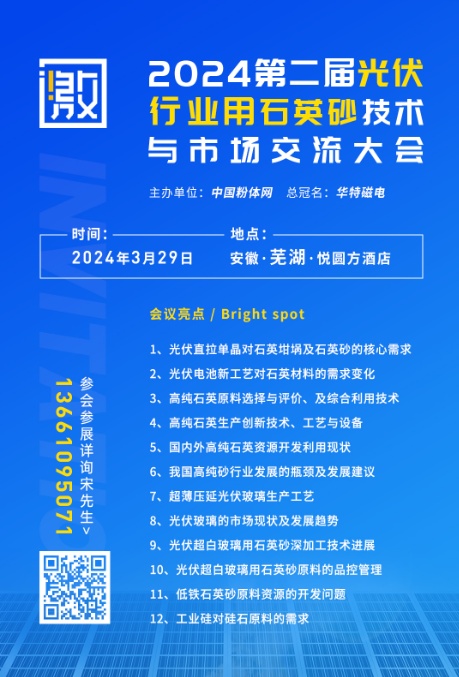 中國粉體網(wǎng)于2024年3月29日在安徽蕪湖舉辦“第二屆光伏行業(yè)用石英砂技術(shù)與市場交流大會(huì)”,江蘇高欣石英科技有限公司邀您一同參加。