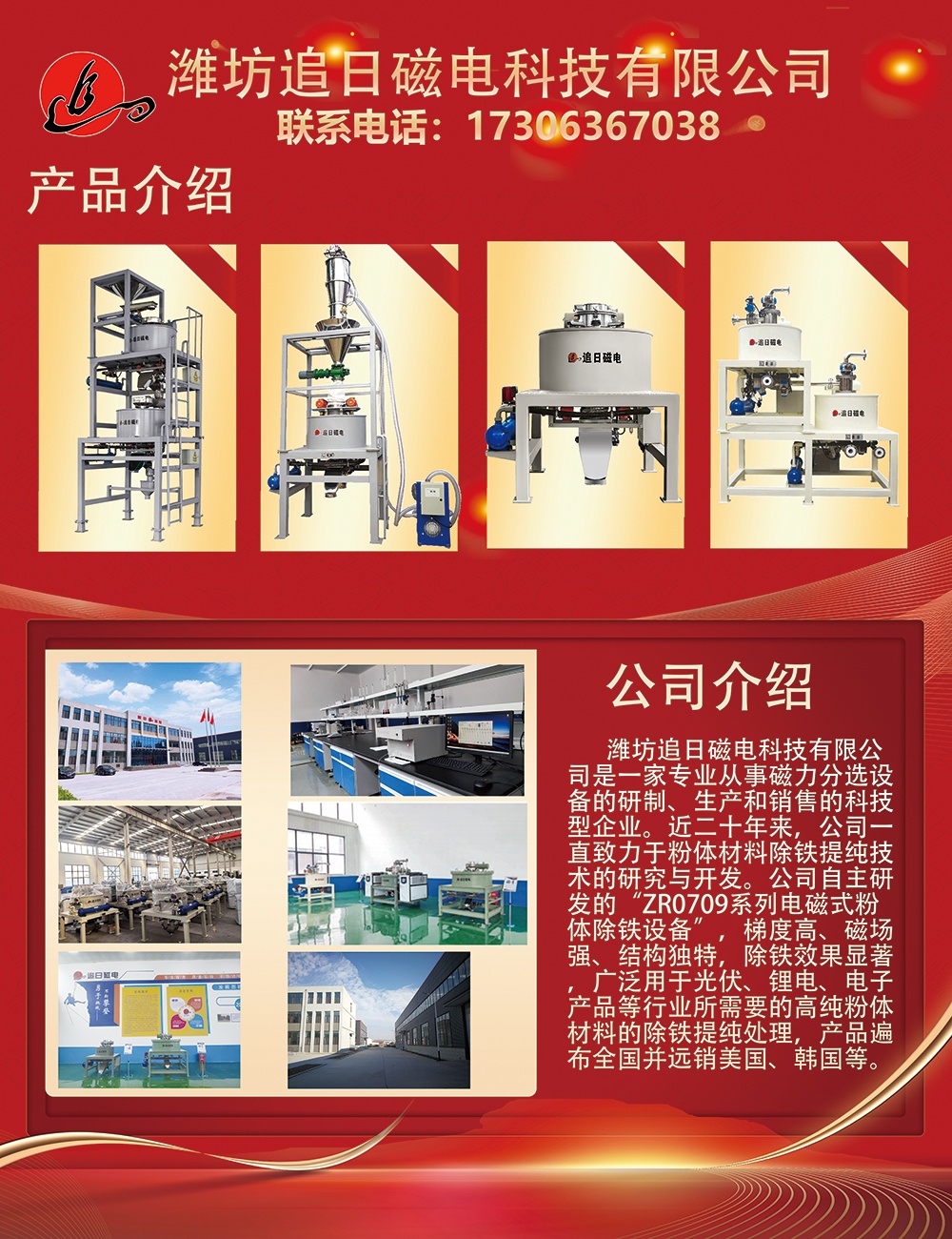 濰坊追日磁電科技有限公司是一家專業從事磁力分選設備的研制、生產和銷售的科技型企業。近二十年來,公司一直致力于粉體材料除鐵提純技術的研究與開發。公司自主研發的“ZR0709系列電磁式粉體除鐵設備”,梯度高、磁場強、結構獨特,除鐵效果顯著,廣泛用于光伏、鋰電、電子產品等行業所需要的高純粉體材料的除鐵提純處理,產品遍布全國并遠銷美國、韓國等。
