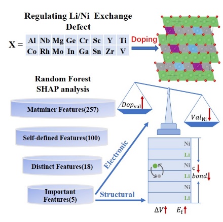 中國粉體網訊 近年來,富鎳層狀正極材料因其高能量密度和低成本備受關注。然而,鋰鎳反位缺陷在材料合成和循環工作的過程中會不可避免地出現,對鋰離子電池性能有著重要影響。前人的大量研究工作通過引入摻雜元素來調節鋰鎳反位缺陷的程度,但由于實驗方法和材料體系的復雜多樣,即使對于相同的摻雜元素也會得出相反的結論,因此在一致條件下系統探究摻雜元素對鋰鎳反位缺陷的影響具有重要意義。然而,摻雜對體系的影響因素十分復雜,難以直接分析,適用于探索復雜高維信息機器學習算法是解決這一問題的有力工具。