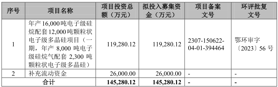招股書顯示,該項目擬分兩期建設。其中一期擬投11.93億元,建設年產8000噸電子級硅烷配套2300噸顆粒狀電子級多晶硅生產線;二期建設年產8000噸電子級硅烷配套9700噸顆粒狀電子級多晶硅生產線。