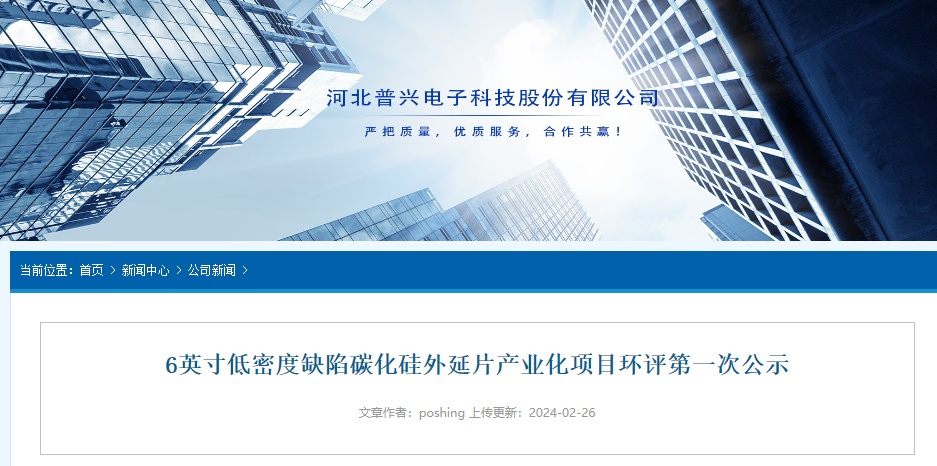 2月26日,河北普興電子科技股份有限公司官網信息顯示,公司“6英寸低密度缺陷碳化硅外延片產業化項目”進行了第一次環境影響評價信息公示。本項目總投資35070.16萬元,項目建成后,將實現年產24萬片SiC外延片的生產能力。
