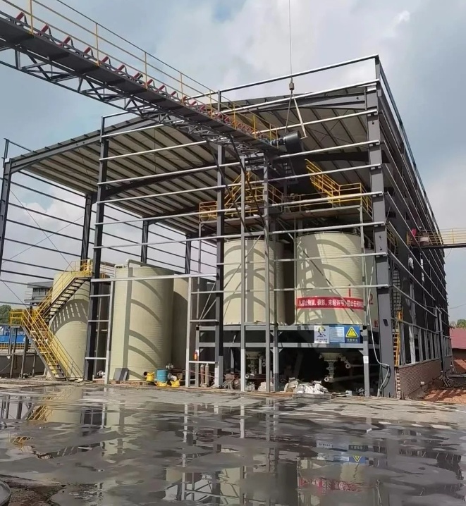 首先開啟電加熱裝置配兌酸液加熱備用,將物料通過輸送方式進入提升機(或輸送帶),經提升機(或輸送帶)將物料送入酸洗反應罐。將配兌好的酸液經酸泵抽入酸洗反應罐內,酸洗進入物料時間約一小時,開啟酸循環。