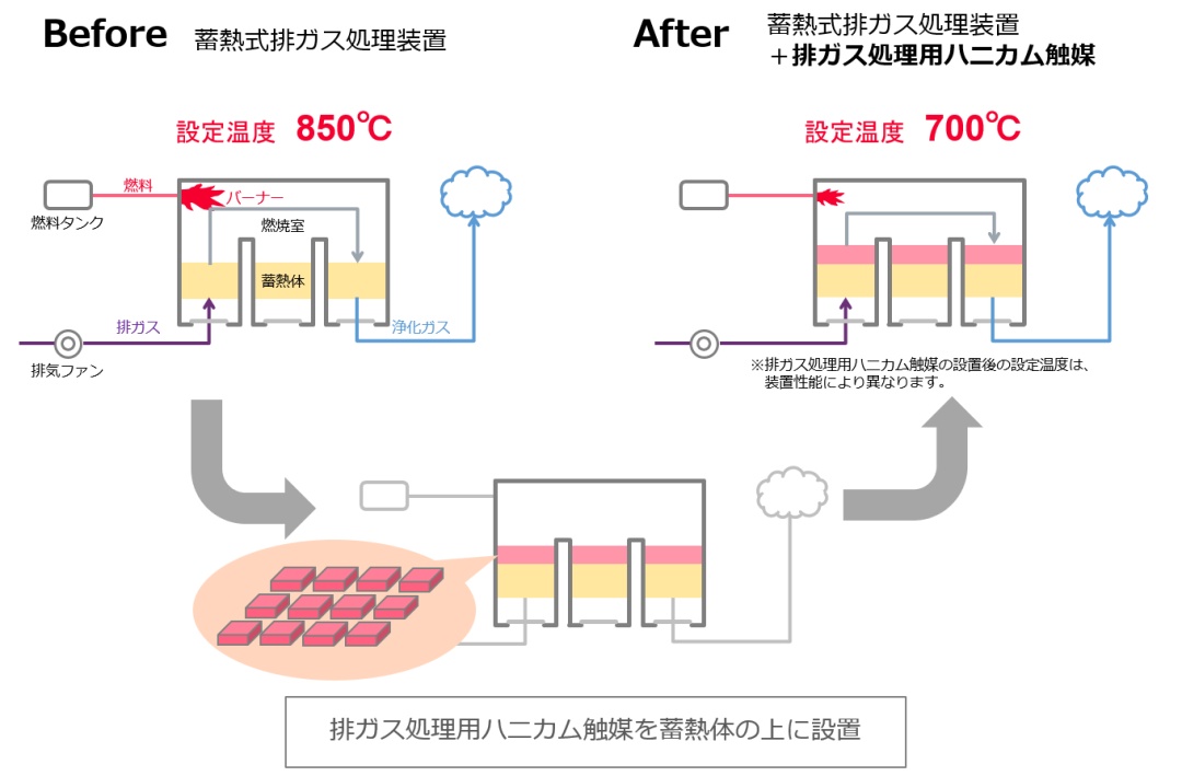 而村田應用陶瓷電容器材料設計技術開發了的這種材料,高耐熱陶瓷結構中嵌入了促進VOC分解反應的活性元素,因此即使燃燒室溫度超過850℃也不會發生熱劣化。因此,即使因濃度波動而導致溫度上升,也可以安全高效地使用。