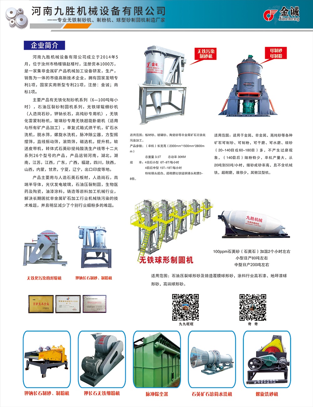 公司專業生產各種制砂制粉生產線→如光伏用低鐵玻璃石英砂無鐵制砂,酸洗線→建筑干粉砂漿制砂線→板材石英砂線→人造彩砂制砂線→人造各色鵝卵石制圓石線→人造各色球型制圓砂線→無鐵超白硅微粉(及球型硅微粉)線→鑄造砂(球型鑄造砂)及鑄造粉線→方解石白云石砂線→高純砂特殊工藝制砂線→鉀鈉長石無鐵制砂制粉線→各種礦石及砂粉烘干線→鋯英砂選鋯提純線→低品位熒石提純線→硅灰石無鐵制粉線,礦石與云母分選提純線等各種制沙制粉細碎制圓,提升,磁選,篩分,除塵,輸送配套設備的生產研發銷售安裝設計。
