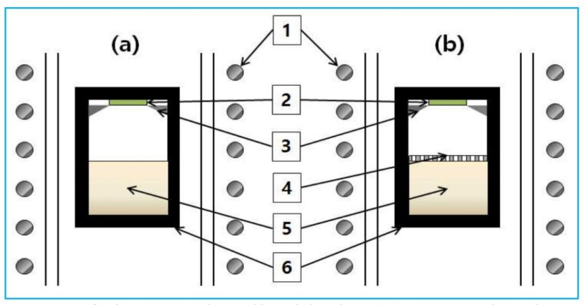 (a)傳統(tǒng)長晶爐,(b)多孔石墨板的長晶爐(圖中4)
