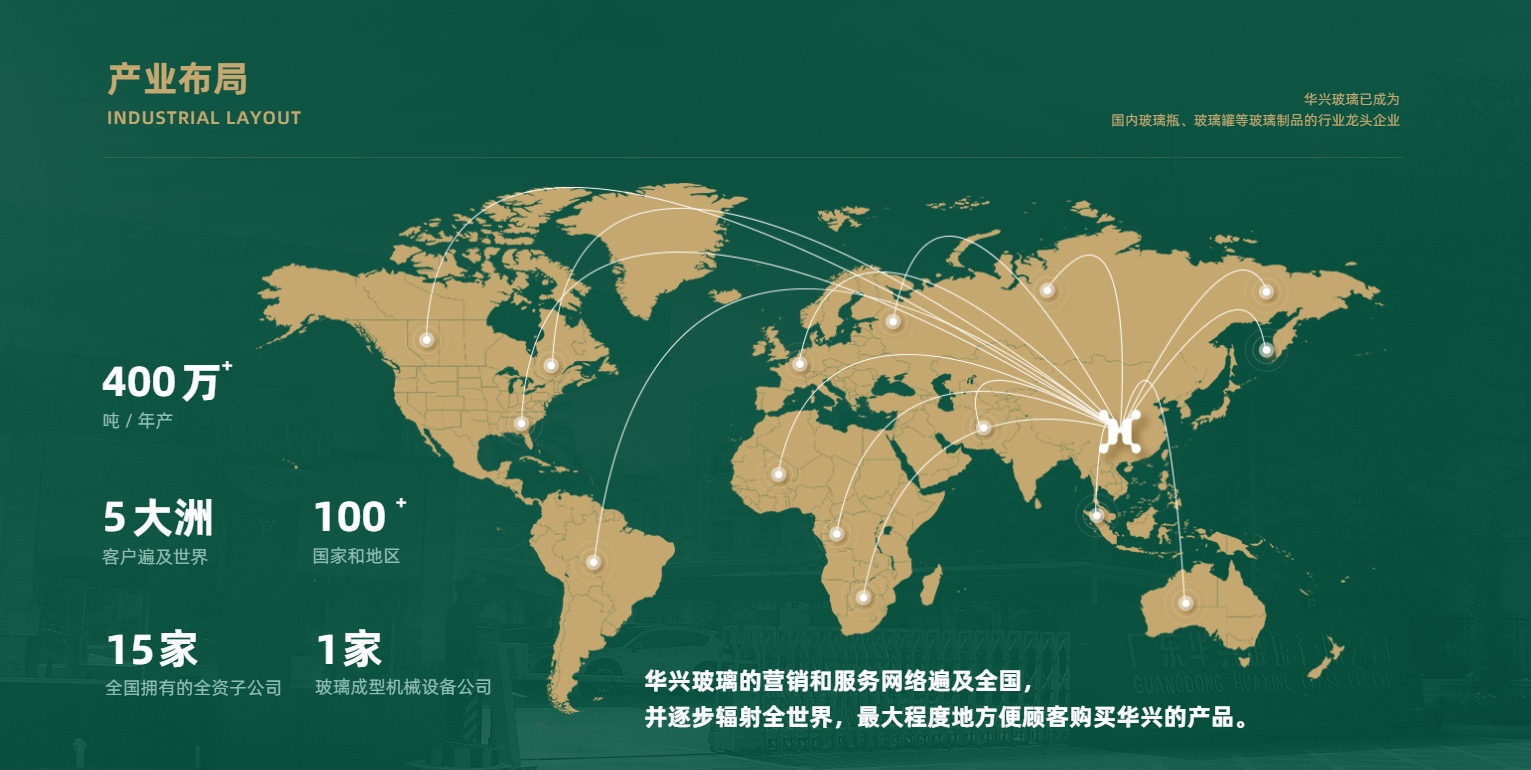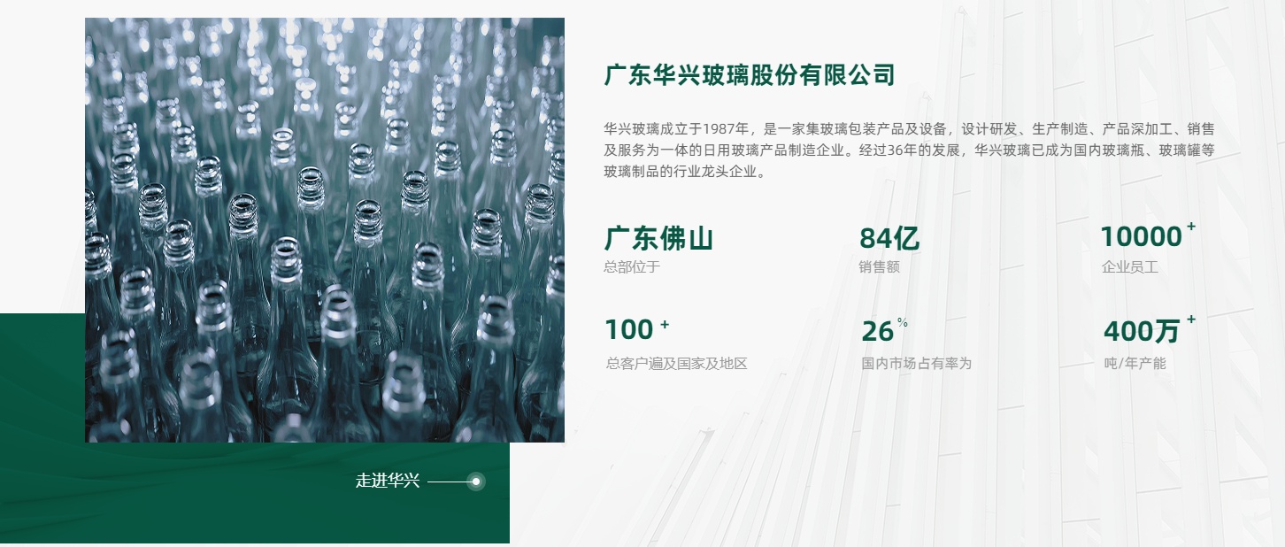 成立于1987年,經(jīng)過36年的發(fā)展,在全國擁有15家全資子公司及1家玻璃成型機(jī)械設(shè)備公司,總部位于廣東佛山;10000余名員工,年產(chǎn)能超400萬噸;客戶遍及世界5大洲,100多個(gè)國家和地區(qū),年銷售額達(dá)84億元,中國國內(nèi)市場(chǎng)占有率為26%。華興玻璃已成為國內(nèi)玻璃瓶、玻璃罐等玻璃制品的行業(yè)龍頭企業(yè)。