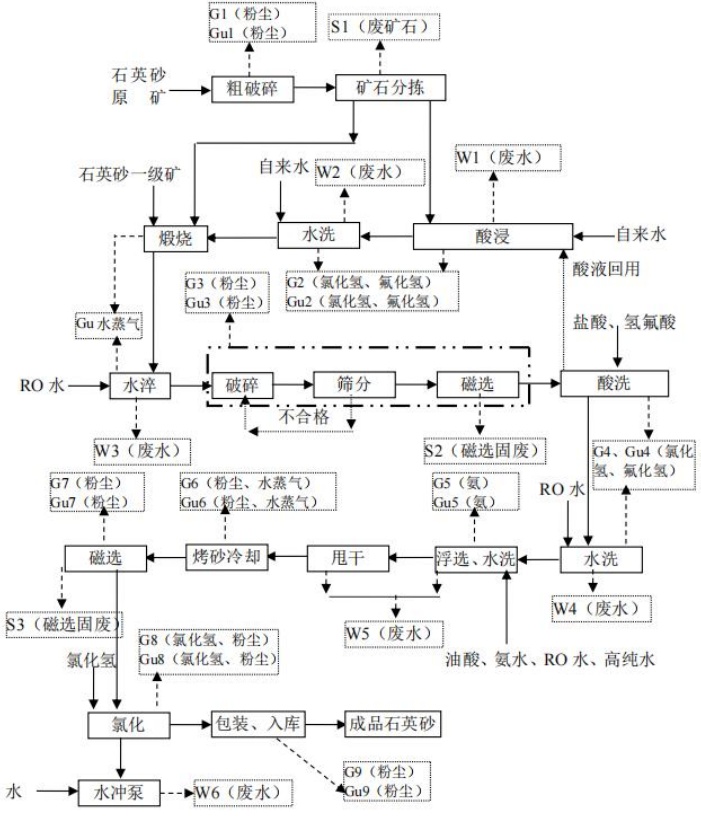 酸洗、水洗:上一工段合格原料顆粒進入反應釜進行酸洗,采用鹽酸(31%)和氫氟酸(42%)混合酸洗,質量比例為16:3。酸洗過程反應釜密閉,酸洗過程用于去除經破碎后,碎石內部的雜物、水銹等,最大限度的去除石英顆粒里面的雜質,酸洗完畢后,將酸液抽入酸浸工序利用。酸洗釜內石英砂再經RO水三次洗滌干凈,整個酸洗、水洗過程在酸洗設備中進行,有效減少酸性氣體的揮發,且不與外界接觸,避免雜質的引入,此工序主要目的為去除石英砂成分中的金屬氧化物,提高石英砂純度。