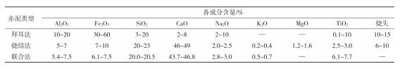 拜耳法、燒結法和聯合法3種工藝所產生的赤泥各組分含量也存在很大差異。其中拜耳法赤泥相比燒結法赤泥具有低硅、低鈣的特點,但是拜耳法赤泥的Fe、Al、Na的含量比燒結法或聯合法赤泥高。廣西平果鋁拜耳法赤泥是國內典型的拜耳法赤泥。