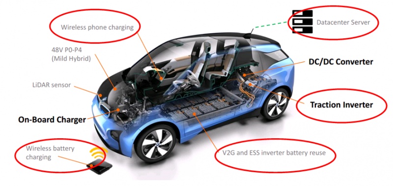 在汽車領域,GaN主要應用于48V系統的功率電子、車載充電機和DC/DC轉換器,將來可以擴展到逆變器。