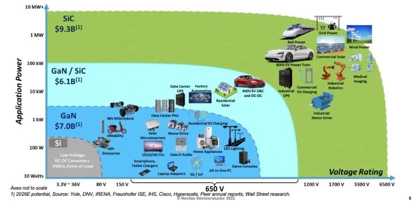 而從總的應用趨勢來看,目前,80V-650V區域是GaN的天下,整個市場規模約為70億美元,手機、筆記本電源適配器、家電是主要應用領域;1200V-6500V的高壓部分更適合碳化硅(SiC),整體市場規模達到了93億美元,電動汽車、新能源、軌道交通、電網等是其核心市場;而在兩者之間則是GaN和SiC可以共存的市場,主要包括數據中心、電動車等,市場規模達到了61億美元。