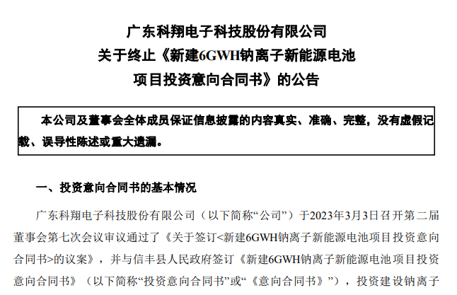 3月19日晚間,科翔股份發布公告,結合公司戰略發展等因素,公司決定終止與信豐縣人民政府簽訂的投資意向合同書。經與信豐縣人民政府友好協商后,于近日簽訂了《<信豐縣人民政府與廣東科翔電子科技股份有限公司關于新建6gwh鈉離子新能源電池項目投資意向合同書>之終止協議》。公司與信豐縣人民政府簽訂投資意向合同書后,雙方并未達成正式投資協議,公司亦未有任何相應的資金支出。