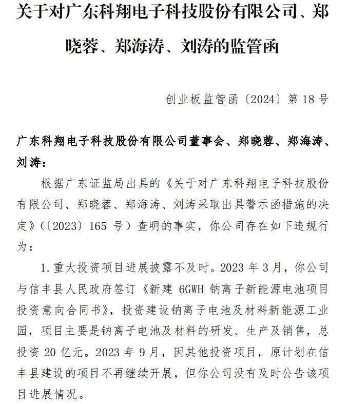 據悉,2023年3月,科翔股份與信豐縣人民政府簽訂《新建6GWH鈉離子新能源電池項目投資意向合同書》,投資建設鈉離子電池及材料新能源工業園,項目主要是鈉離子電池及材料的研發、生產及銷售,總投資20億元。2023年9月,因其他投資項目,原計劃在信豐縣建設的項目不再繼續開展。今年2月,科翔股份因前述項目進展披露不及時,被廣東證監局出具警示函,并收到交易所監管函。