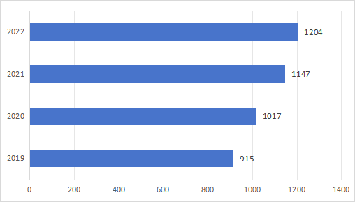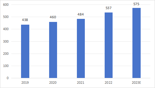 近年來,全球MLCC市場規模穩中有升。在新冠疫情期間,2020年初,大部分的MLCC企業的正常生產經營被迫終止。隨著疫情緩解,MLCC企業逐漸恢復生產。如圖1所示,自2019年,全球MLCC市場規模約為915億元,至2022年增長到1204億元,預計此后,繼續保持上升趨勢。