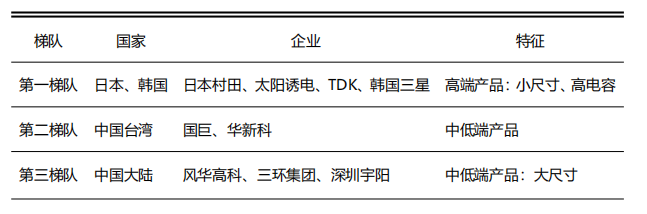 全球MLCC主要制造商主要集中在日本、韓國、中國臺灣、中國大陸,其中,日本地區企業的市場占有率高達56%,遙遙領先,而中國大陸MLCC制造商約占全球7%的數額。全球MLCC主要廠商可以分為三個梯隊,如表1所示。