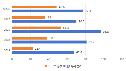 圖3 2019-2023年中國MLCC進出口貿易額及預測(單位:億美元)