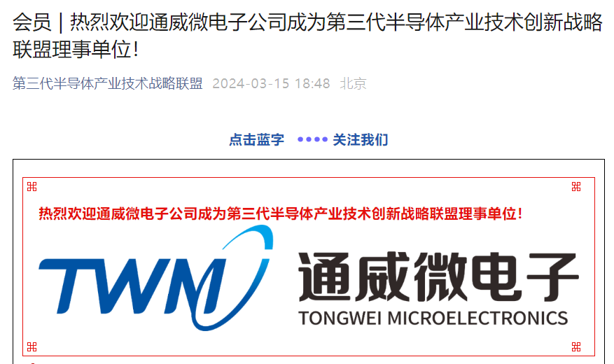 中國粉體網訊 近日,第三代半導體產業技術戰略聯盟消息,通威微電子有限公司已正式加入聯盟并成為理事單位。