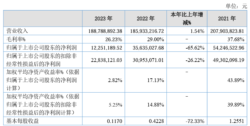 中國粉體網(wǎng)訊 3月26日,天馬新材發(fā)布2023年年報,報告期間,公司實現(xiàn)營業(yè)總收入1.89億元,同比增長1.54%,歸母凈利潤1225.12萬元,同比下降65.62%。