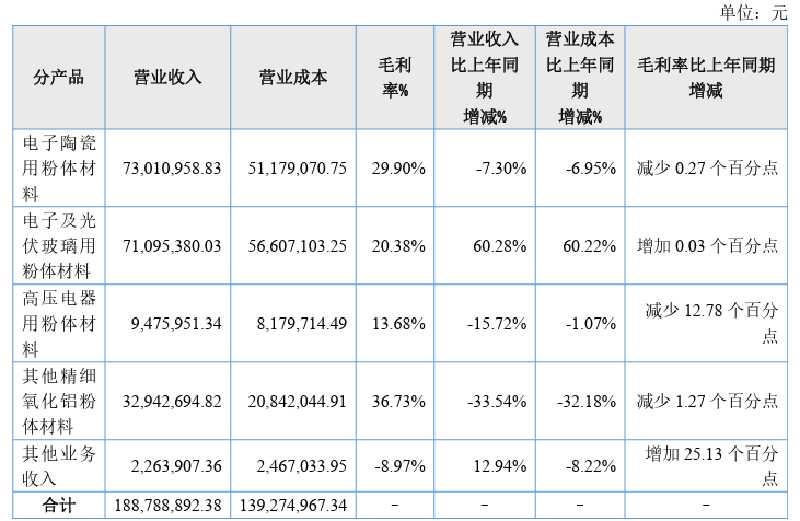 緊抓液晶基板玻璃發(fā)展戰(zhàn)略機遇期,配合下游主要客戶擴產(chǎn)需求,同時覆蓋新領(lǐng)域新客戶,電子玻璃類粉體全年銷售收入較上年同期增長60.28%。