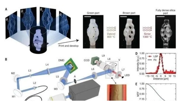 中國粉體網訊 此前,《Science》曾以封面文章發表采用軸向光刻3D打印石英玻璃的研究。源于從微光學器件到用于化學合成和生物分析的微流體系統對玻璃的尺寸、幾何形狀、表面粗糙度和機械強度要求的發展,傳統的加工方法受到挑戰。來自美國加州大學伯克利分校、勞倫斯利弗莫爾國家實驗室以及德國弗萊堡大學的研究人員,研究了石英玻璃的微尺度計算軸向光刻3D打印技術,也即通常被稱之為的體積3D打印。