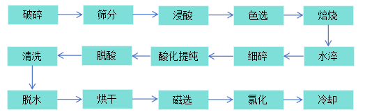 生產過程主要以石英石毛料為原料,以鹽酸、氫氟酸、等為輔助材料,通過破碎、篩分、浸酸、色選、焙燒、水淬、細碎、酸化提純、脫酸、清洗、脫水、烘干、磁選、氯化、冷卻等工序生產高純石英砂;