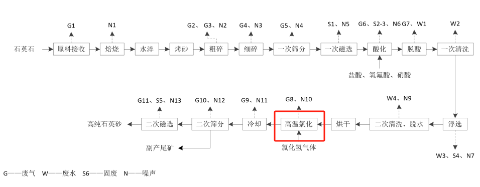 高純石英砂以石英石原石為原料,經焙燒、水淬、烤砂、粗碎、細碎、一次篩分、一次磁選、酸化、脫酸、一次清洗、浮選、二次清洗及脫水、烘干、高溫氯化、冷卻、二次篩分、二次磁選等工藝制得。其中,高溫氯化可將石英砂中的Fe、Al等雜質的含量進一步降低,從而使石英砂的純度更高。