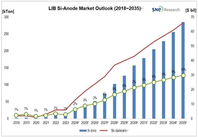 SNE Research發布的《2024年鋰離子電池硅負極技術現狀與展望》報告顯示,隨著這一新型負極材料應用從3C消費向動力電池領域拓展,預計2024年硅負極的市場滲透率也將突破長期以來1%的封印,步入上升軌道,市場規模將以39%的復合年增長率,一路飆升至2035年的660億美元,整體市場滲透率也將達到10%左右。