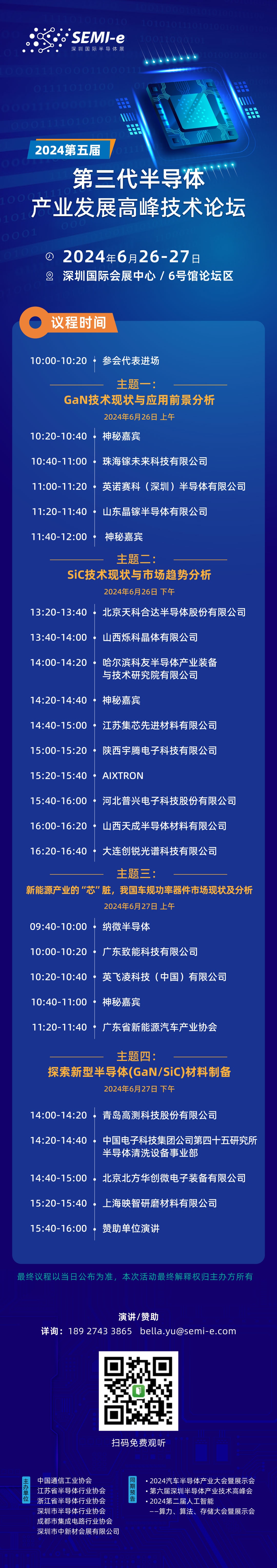 聚焦半導體產業熱點,【SEMIE半導體】實時報道,由中新材會展等聯合主辦的SEMI-e 2024第五屆第三代半導體產業發展高峰技術論壇于2024年6月26-27日在深圳國際會展中心召開,此次峰會聚焦碳化硅、氮化鎵等熱門主題 ,深入探討我國車規功率器件市場的現狀與發展趨勢等。