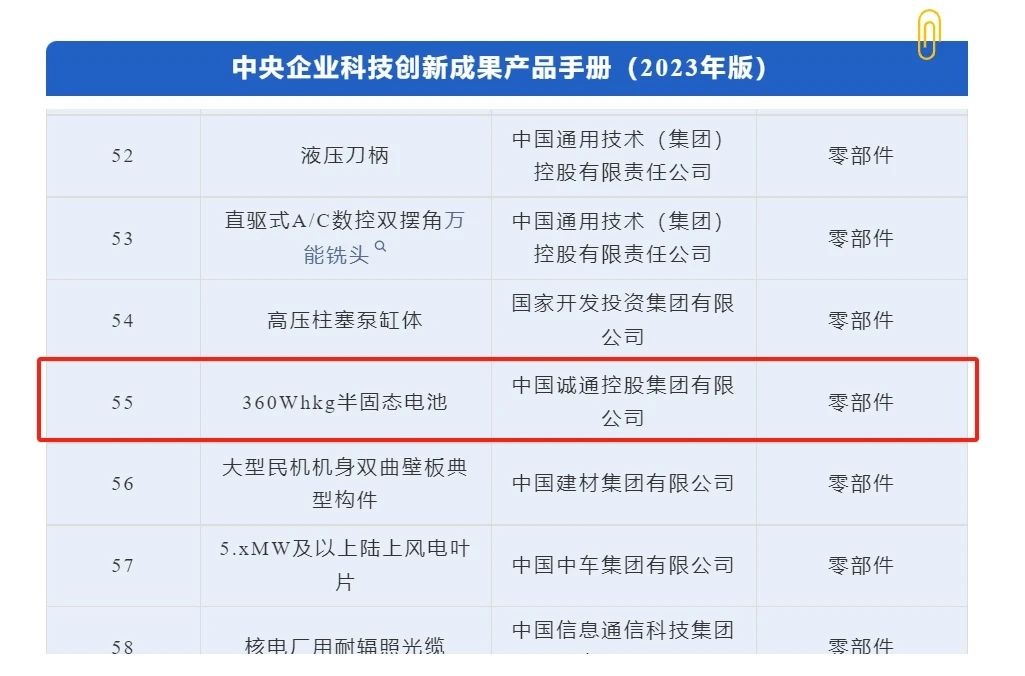 中國粉體網訊 為加快中央企業科技創新成果應用推廣,加速科技成果向現實生產力轉化,培育發展新質生產力的新動能,國務院國資委組織開展科技創新成果征集遴選工作,經企業推薦與專家評審編制形成《中央企業科技創新成果產品手冊》(2023年版),力神360Wh/kg半固態電池成功入選。